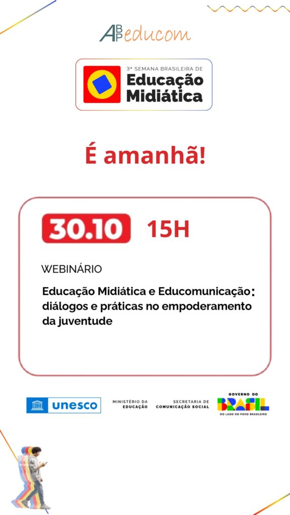 Nesta quinta-feira (30/10) às 15h, a Associação Brasileira de Pesquisadores e Profissionais em Educomunicação (ABPEducom) participará da 3ª Semana Brasileira de Educação Midiática, promovendo o webinário “Educação Midiática e Educomunicação: diálogos e práticas no empoderamento da juventude”. O evento é realizado pelo Ministério da Educação (MEC) e pela Secretaria de Comunicação Social (SECOM), com cooperação da UNESCO.