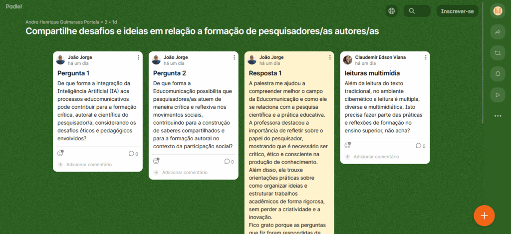 Os participantes do encontro puderam dirigir suas perguntas a professora e contribuíram com o debate por meio de um padlet disponibilizado pela organização da transmissão, que contou com discentes da disciplina de Metodologia do Ensino da Educomunicação com Estágio Supervisionado da graduação em Educomunicação da USP e o apoio de Luisa Foganholo Bueno, bolsista PUB.