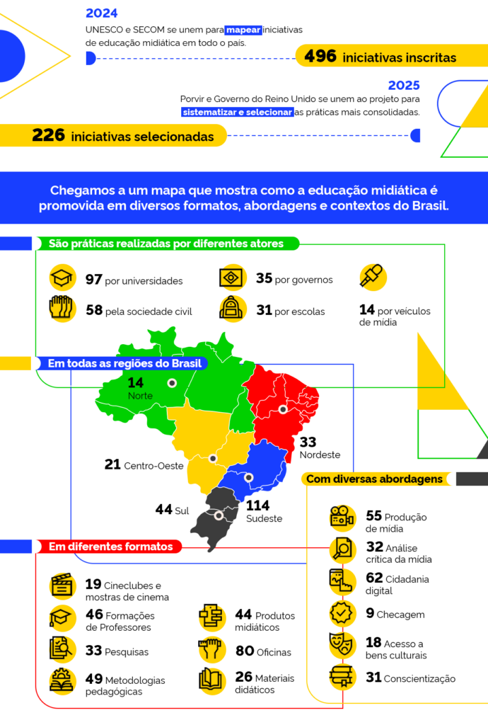 Com apoio da Unesco, o Ministério da Educação (MEC) lançou o Mapa Brasileiro da Educação Midiática com 226 experiências. A plataforma interativa foi elaborada pela Agência Porvir em parceria com a Secretaria de Comunicação do Paraná (Secom PR).